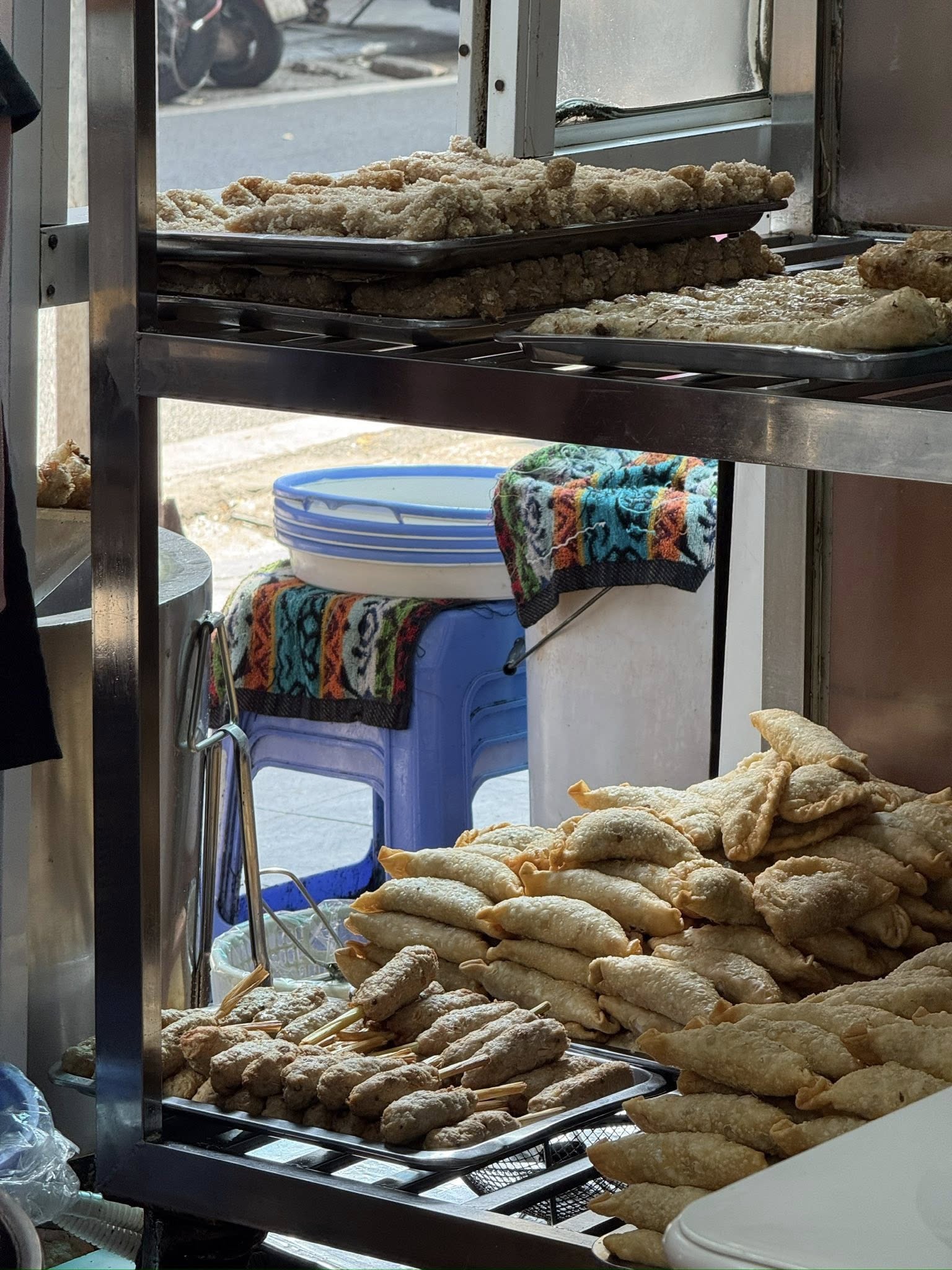鋼架攤車內一層層堆滿現炸油物——